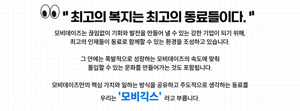 모비긱스는 나의 성장이 팀의 성장이라는 팀 스피릿을 공유합니다.